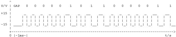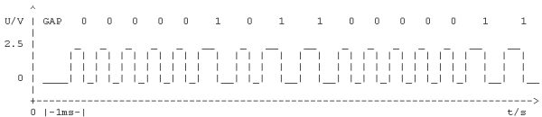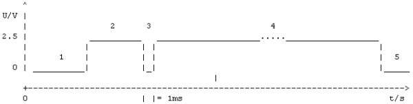 Auf dem Weg vom Sender zum Decoder werden die Bits physikalisch nicht als Spannungspegel codiert, sondern als Zeiten (Zeitcodierung). Für die Übertragung einer Eins wird die Datenleitung 400µs lang auf einen Spannungspegel von ca. 2.5 Volt (high) gelegt, danach für weitere 400µs auf 0V (low). Eine Null wird übertagen, indem die Datenleitung 200µs auf high gelegt wird, danach 200µs auf low. Die Übertragung eines Rahmens (also der gesamten 16 Bits) beginnt mit einer 800µs langen Pause (Gap, low), die die Decoder zur (Re-) Synchronisierung verwenden. Vom Booster zu den Decodern wird das selbe Codierschema eingesetzt (es wird also nicht umcodiert). Nur werden die Spannungspegel so verschoben, dass die Decoder zu jedem Zeitpunkt mit Strom versorgt werden: low entspricht dann einem Pegel von -20V..-15V und high einem Pegel von +15V..+20V. ![]() Das Datenformat auf der Leitung vom Sender zum Booster ![]() Die Spannung auf den Schienen während der Datenübertragung 3. Synchronisierung der Sender Wie wird vermieden, dass zwei Sender zur gleichen Zeit Daten übertragen? Hier geht es zu, wie in der Schule: Normalerweise ist die Handshake-Leitung low (1). Hat ein Sender Daten zu senden, so setzt er die Handshake-Leitung auf high (ca. 2.5V, genau wie bei der Datenleitung, 2). Dies entspricht einer Wortmeldung in der Schule. In diesem Zustand hat der Sender zu warten, bis die Handshake-Leitung von Booster auf low gezogen wird (3). Das entspricht dem Aufruf durch den Lehrer. Der Sender kann jetzt loslegen. Währenddessen lässt der Booster die Handshake-Leitung wieder auf high gehen (4). Ist der Sender mit der Übertragung fertig, so setzt er die Handshake-Leitung wieder auf low (5). Jetzt sucht der Booster nach einem weiteren Sender mit aktiver Handshake-Leitung und das Spiel beginnt von neuem. Auf diese Weise verteilt der Booster die Sendezeit zentral, gleichmässig und gerecht auf alle jeweils sendewilligen. Es wird aber keine Zeit verbraucht für Sender, die gerade nichts zu senden haben. ![]() Das Handshake-Protokoll Alle im Folgenden präsentierten Digi-Train Systemelemente erzeugen, bzw. verarbeiten das hier beschriebene Datenformat. Wer das System um eigene Elemente erweitern will (Wie wäre es z.B. mit einem alten C64 oder ZX81 als Steuerconsole) muss eine elektrische Schnittstelle bauen, die dem oben beschriebenen Protokoll gerecht werden kann. Der Rest ist dann nur eine Frage der Software... Übrigens: Wenn Sie nur einen Sender betreiben wollen, können Sie das Handshake-Protokoll vollständig ignorieren. Verbinden Sie hierzu boosterseitig einfach die Handshake-Leitung mit Masse. Sobald der Sender etwas senden will kann er dann loslegen! Die genannten Marken- oder Produktnamen sind Warenzeichen oder eingetragene Warenzeichen der jeweiligen Eigentümer |