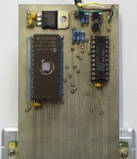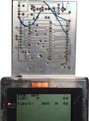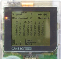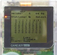 Als besonderes Schmankerl ist es möglich zwei Loks miteinander zu synchronisieren, d.h. einen Zug mit zwei Loks (in Doppeltraktion) zu fahren. Gesteuert wird dabei nur eine Lok, die zweite wird automatisch mit gesteuert. Das schöne Grafikdisplay des GAME BOY zeigt z.Zt. alle Informationen in Textform an. Man muss ja auch "später" noch mal was zu tun haben ;-) Die Schaltung ist eigentlich auch ganz übersichtlich: Im unteren Bildteil sieht man den bekannten Schaltungsteil zum ANschluss an die Leitung zum Booster, auch der 7805 Spannungsregler ist vorhanden. Leider dient er nur zur Spannungserzeugung für das EPROM und das GAL der Modulplatine. Der GAME BOY lässt sich nicht über die Modulschnittstelle mit Strom versorgen. Dies verhindert eine kleine Diode, die der beherzte auch entfernen kann. Für alle anderen gilt: Batterien kaufen. Der Rest der Schaltung besteht aus einem EPROM des Typs 27C256 welches "einfach" sn den Bus des GAME BOY angeschlossen ist. Das Programm habe ich mit Pascal Felbers GAME BOY-Entwicklungssystems erzeugt und mit einem EPROM-Programmiergerät in das EPROM gebrannt. Der GAL 16V8 Baustein hängt ebenfalls am GAME BOY-Bus. Er realisiert zwei adressierbare D-FlipFlops (für die Daten- und Hanshake Leitung) und einem adressierbaren Buffer (für die Handshake abfrage). Diese drei Bits werden in den Adressraum des GAME BOY eingeblendet und können vom Programm aus über einen Zeiger angesprochen werden. Die unten abgebildete Variante der Platine ist die "L"-Version (lang). Sie ermöglicht es, das Modlul im GAME BOY zu betreiben und trotzdem an den Bausteinen zu messen. Auf dem Foto oben ist zu sehen, dass die Lötseite des Moduls oberhalb des GAME BOY-Displays aus dem Gerät heraus schaut.