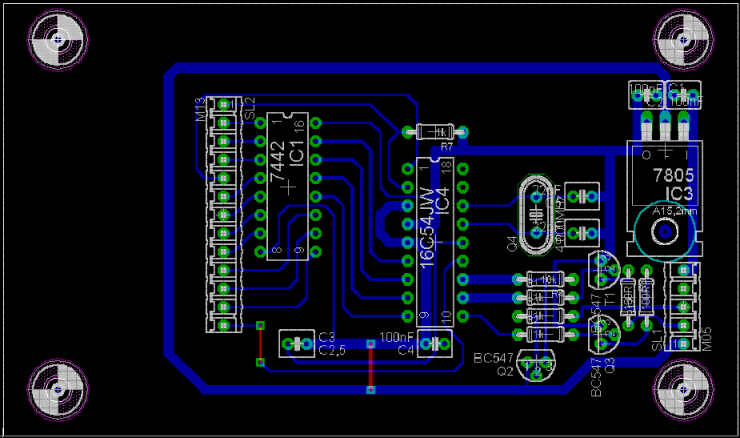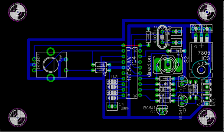 Layout des Weichensenders Downloads Weichensender: Stückliste, Lötseite (Gerber-X), Bestückungsseite (Gerber-X), Umriss (Gerber-X), Bohrdaten (Exellon), Bohrer Software: Quellcode (PIC Assembler, V3.1 beta), Zielcode (Intel HEX File, V3.1 beta).