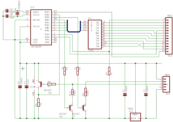 Schaltung der Loksenders Über den Steckverbinder SL1 gelangt die Versorgungsspannung von ca. 8V (aus dem Booster) an IC3, einen Spannungsregler vom Typ 7805. Dieser erzeugt die Versorgunngsspannung für den Mikrocontroller und die Ausgangsstufen. Datenleitung: Pin 11 des Mikrokontrollers (IC4) ist der Datenausgang, der über R1 den Transistor T1 ansteuert. T1 zieht, wenn er angesteuert wird, die Leitung an Klemme 2 (Daten) auf ca. 2,5V und erzeugt damit auf dieser Leitung einen high-Pegel. Sperrt T1, so wird die Leitung boosterseitig auf low-Pegel gezogen. Der Widerstand R6 dient zur Anpassung des Ausgangswiderstandes der Treiberstufe an den Wellenwiderstand der Leitung. Handshakeleitung: Pin 12 von IC4 dient als Eingang zur Abfrage des Zustandes der Handshakeleitung (Klemme 3). Hierzu setzt Q2 mit R4 den Pegel an Klemme 3 in ein (invertiertes) TTL-Signal um. R3 dient hierbei zur Begrenzung des Basisstromes für Q2. Über Pin 10 kann der Mikrokontroller den Zustannd der Handshakeleitung beeinflussen. Der Transistor Q3 zieht, wenn er angesteuert wird, die Leitung an Klemme 3 (Handshake) auf ca. 2,5V und erzeugt damit auf dieser Leitung einen high-Pegel. Sperrt Q3, so wird die Leitung boosterseitig auf low-Pegel gezogen. Zum Funktionsprinzip des Handshakes, siehe Protokoll. Benutzerschnittstelle: Die Schnittstelle zum Benutzer besteht aus einem Ein-Aus-Ein Schalter (S1, mit Mittelraste) und einem Drehimpulsgeber (Sw1). Die Widerstände R7, R8, R9, R10 und R11 ziehen die Pins 1, 2, 12, 13 und 18 von IC4 auf high-Pegel. Je nach Stellung des Schalters, bzw, des Drehimpulsgebers werden einzelne Pins von IC4 auf low-Pegel gezogen. Die Software des Mikrokontrollers berechnet aus den Signalmustern der Eingangspins ein entsprechendes Lokkommando. Adresseinstellung: Die (8-bit) Adresse der Lok, die mit dem jeweiligen Kontroller angesteuert werden soll wird an zwei Stellen eingestellt. Die 4 höherwertigen Bits (MSB, Domänenadresse) sind Teil der Kontrollersoftware und werden bei der Programmierung von IC4 eingestellt. Die 4 niederwertigen Bits (LSB, Lokadresse) können über die Lötjumper SJ1 bis SJ4 eingestellt werden. Takterzeugung, Entkopplung: Das Quartz Q4 und die Kondensatoren C3 und C6 dienen der Takerzeugung. Hierzu ist am Mikrokontroller die Oszillatoroption "HS" einzustellen. Die Kondensatoren C1, C2 und C4 dienen der Entkopplung und der Vermeidung von Schwingungszuständen des Spannungsreglers IC3.