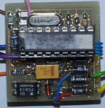 Der Decoder. Ja, sie haben richtig gelesen. Es gibt für dieses System nur einen Decoder, der -sie können es sich schon denken- auch auf einem PIC 16C54 basiert. Der Decoder (30mm x 35mm) lässt sich in Loks, Weichen, Signale und sonstiges einbauen . Das klappt, weil der Decoder entsprechend universell ausgelegt ist. Was der Decoder macht (bzw. wie sich seine Ausgänge verhalten) wird einzig und allein duch die Steuersoftware festgelegt. Der Decoder kann, was seine Leistung betrifft, schwächer ausgelegt werden. Damit, und mit der Verwendung eines 16C54 im SMD-Gehäuse lässt sich der Decoder noch weiter verkleinern.